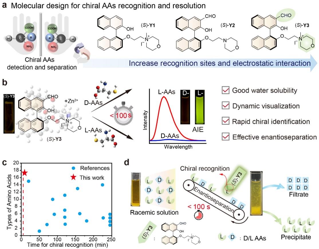 针对上述问题,研究团队将吗啉鎓季铵阳离子引入1,1'-联-2-萘酚分子骨架,设计并合成了一种手性荧光探针,在水溶液中成功实现了对氨基酸对映体的快速手性识别,及外消旋混合物中单一氨基酸对映体的分钟级高效手性分离。该探针与17对游离氨基酸对映体相互作用时,可在100秒内实现快速手性区分,并伴有显著的发光颜色或强度变化。研究表明手性识别机制涉及亚胺形成和静电相互作用,并伴随聚集诱导发光效应。这些过程共同促进了探针与特定氨基酸对映体之间的选择性聚集与沉淀。采用古双喜团队开发的该方法,通过简单过滤即可从D-/L-氨基酸混合物中高效分离出目标对映体,光学纯度达99%以上,且分离过程可视化。团队进一步结合荧光可视化和手性高效液相色谱对比分析,验证了该探针在手性分离方面的有效性。该研究面向生命大健康国家战略,服务于湖北生物医药产业发展,为氨基酸对映体的精准检测与分离提供了一种简单快捷的新方法,具有非常重要的科学意义和应用价值。